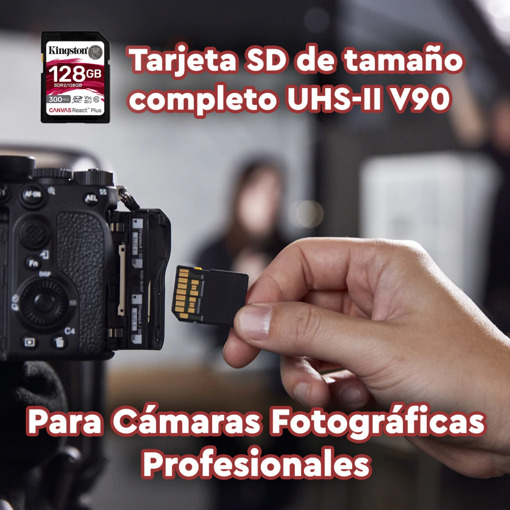 No comprometas tu creatividad. Con la 128GB Kingston® CANVAS React™ Plus SDXC™ UHS-II V90, tendrás el respaldo que necesitas para capturar y almacenar tus mejores momentos.