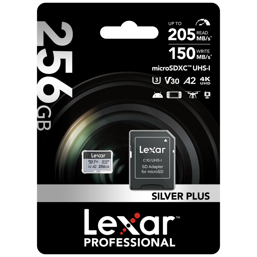 Con clasificación V30, la tarjeta Lexar Professional SILVER PLUS microSDXC™ UHS-I está diseñada para capturar fotos en ráfaga sin perder una toma y graba sin problemas videos ultra-HD de hasta 4K a 60 fps.